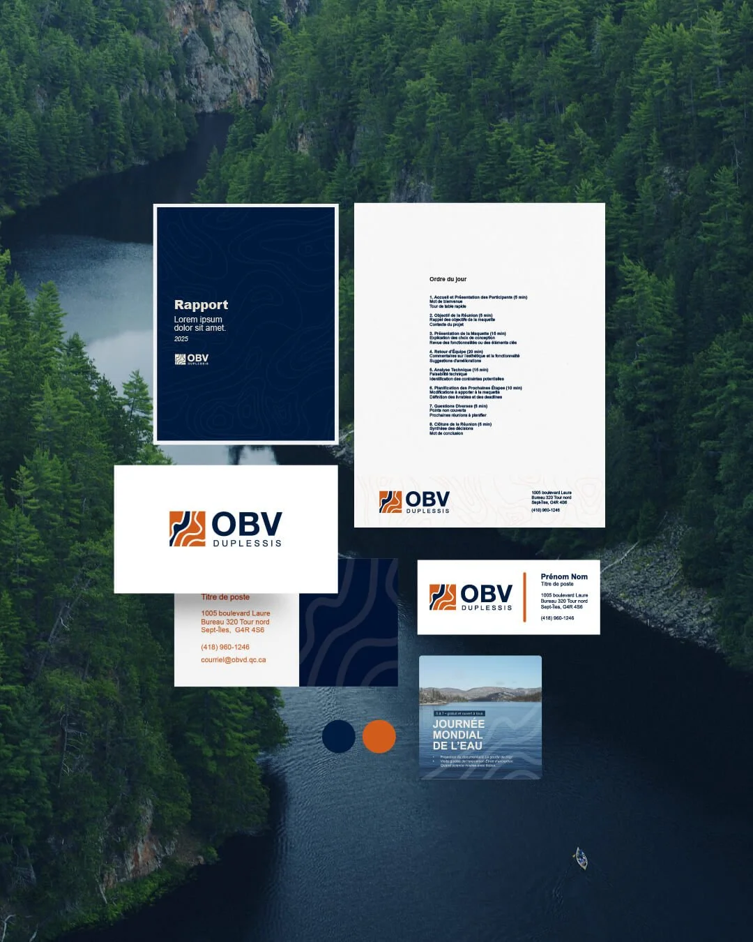 Création de l’identité visuelle complète de l’Organisme des bassins versants Duplessis, inspirée du territoire, de l’eau et des phénomènes naturels propres à la région. Le logo combine des courbes fluides évoquant le mouvement de l’eau, des motifs rappelant les aurores boréales et une structure inspirée des lignes topographiques, symbolisant à la fois vitalité, précision et ancrage scientifique. L’ensemble donne une identité à la fois moderne, harmonieuse et profondément liée au territoire, déclinée dans une série de gabarits visuels pour la papeterie et les réseaux sociaux.